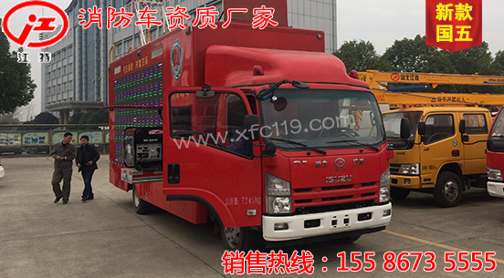 該款宣傳消防車采用軸距為4475MM的五十鈴底盤,馬力為191,機動靈活,科技含量高,集成性強,與國內同類車型比較.具備馬力大.自重輕.油耗低.使用壽命長.舒適.安全.環(huán)保等綜合優(yōu)勢?蓮V泛滿足.物流.市政.環(huán)衛(wèi).通訊.登高.金融.煙草.電力等市場需求。該車將為社區(qū),消防隊宣傳普及消防知識和消防意識立功出力,是社區(qū),政府,消防隊采購宣傳用車的不二選擇。