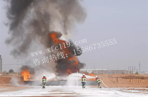 本次滅火演練分為100㎡原油火與9㎡甲醇火,并由上海消防研究所進行數據采集工作。首先進行的是100㎡原油火滅火實驗,在油池中注入10噸原油后,由主持人宣布活動開始,下達指令后,3名消防隊員開始行動,在點燃油池的瞬間,可以看到火焰開始快速向上燃燒,大量的熱輻射開始向四周蔓延,此時油池底部的溫度為8℃,油面溫度為11℃,加熱至18分鐘后,油池底部溫度達到了189℃,火焰溫度為900℃,此時現場能聽見油池傳來的陣陣爆鳴聲,面對著熊熊烈火,現場所有領導與嘉賓都屏息以待,隨即,3名消防隊員持槍攻進火場,當CAFS微細壓縮空氣泡沫接觸到火面的瞬間,在場所有人都能感到熱輻射的明顯下降,不再有熱浪的侵襲,3名消防隊員運用戰術,相互配合,短短47秒的時間,將100㎡的原油火迅速撲滅,主持人此刻播報溫度數據,油池底部溫度為100℃,油面溫度為33℃,油火不再復燃,泡沫可以掛在罐壁上。僅僅出動3名消防人員用時47秒,11.5L泡沫混合液與371.5L的水即完成了這場100㎡原油大火的滅火行動,現場所有領導、嘉賓一同見證了這一精彩時刻。