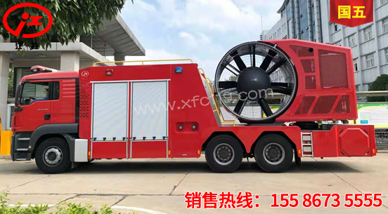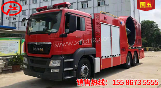 德國曼排煙消防車采用德國曼恩TGS33.480底盤改裝,平頭單排帶臥駕駛室,液壓翻轉,德國曼D2676LF40發動機,485馬力,主要功能是消防排煙。 |