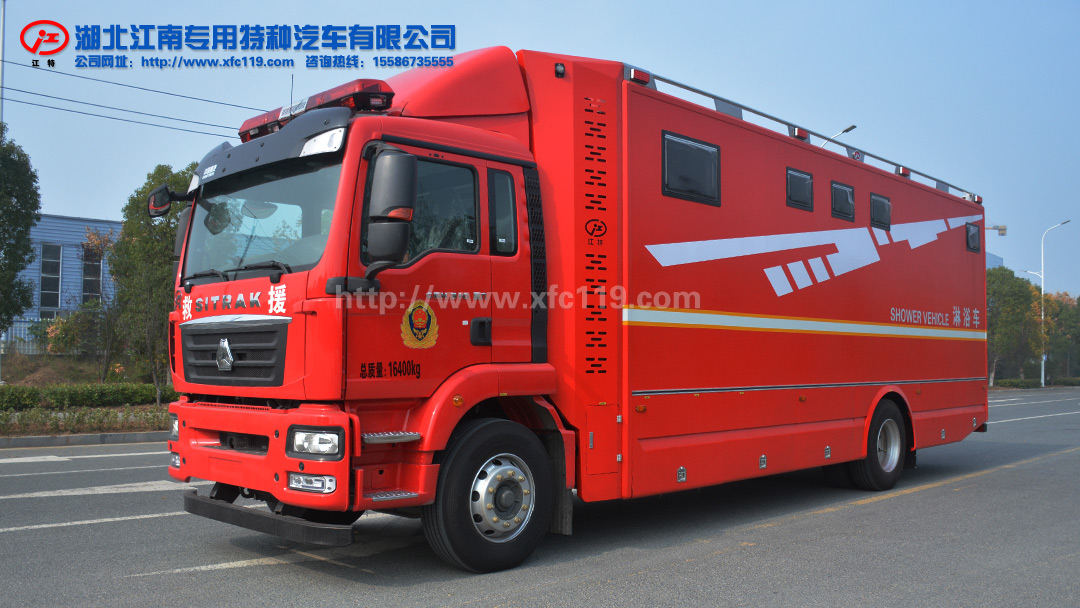 湖北江南專用特種汽車有限公司“江特牌”淋浴車系列產品,專用于改善野外生活保障條件,提高野外執(zhí)行任務保障能力。廣泛適用于軍隊、公安特勤、消防、醫(yī)療衛(wèi)生、搶險、應急救援等多種用途。車內配置齊全,完全滿足單次 8 人同時淋浴保障用途。整車主要由機動性能較高的二類底盤、水電保障系統(tǒng)、淋浴設備等組成。該車主要特點:
